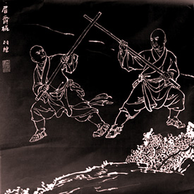 In a small tribe of Southern India a prince, Bodhidharma (Ta Mo), was born. He became a Mayhayana Buddhist at an early age and, as part of his training, he practiced hard exercises and training in addition to meditation and study. In 527 AD, Ta Mo traveled east into China preaching the ways of Mayhayana Buddhism. Upon reaching the temple in Honan, he found the monks weak and without physical ability. Their pious lifestyle consisted of constant seated meditation and a great lack of physical activity (which left them weak and vulnerable if ever attacked). Ta Mo then spent the next 9 years in a cave 30 minutes away from the Temple meditating on the problems within the Shaolin walls. Eventually, he developed a series of exercises designed to strengthen the monks physically as well as mentally. They were called, "Muscle Change Classics", "Marrow Washing Course", and "The 18 Hand Movements of the Enlightened One". This marked the beginning of Shaolin Kung Fu (Kung Fu - hard work and perfection). The monks took Ta Mo's exercises and blended them with local self defense techniques creating what was known as the 'Lo Han' style. From that moment on, the monks at the Shaolin temple dedicated themselves to the perfection of their fighting arts. Continuously upgrading and developing their system of self defense, the monks added the techniques of Chin Na (joint locks), Shuai-Chiao (wrestling/throwing), and Chi Kung (internal energy). As a result, the Shaolin monks were quickly recognized for their superior skills. It was said that a Shaolin monk was worth a 1,000 soldiers.